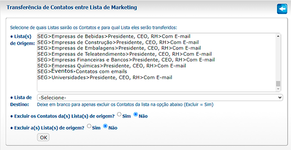 Os Contatos de sua base de dados podem ser armazenados conforme o perfil, a origem, o projeto, ou qualquer característica que você tenha definido para a Lista em questão. Sua necessidade e imaginação é que irão definir quais e quantas Listas de Contatos irá criar.