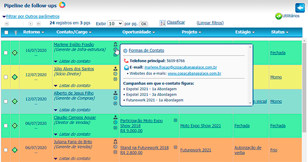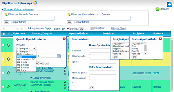 Uma verdadeira central de contatos com clientes, o Pipeline de vendas traz os próximos contatos a efetuar, e as perspectivas futuras das oportunidades abertas pelo time de vendas. Os follow-ups podem ser filtrados por diversos campos, inclusive pelos Projetos em que estão envolvidos, e também por campos de Oportunidades, Listas e Campanhas.
