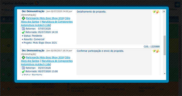 Com a devida permissão de acesso, os gerentes de vendas podem acompanhar o andamento dos contatos efetuados e a efetuar de um vendedor específico, ou do time de vendas inteiro.